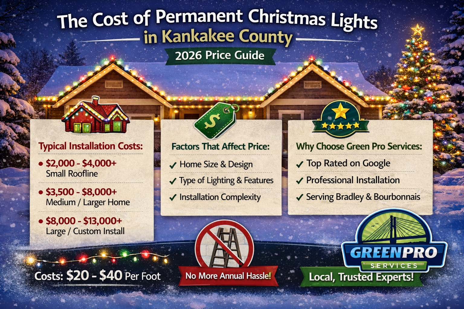In this 2026 price guide, we’ll break down what permanent Christmas lights cost, what factors influence pricing, and why Green Pro Services is widely considered the best company for Christmas light installation in the Kankakee area.